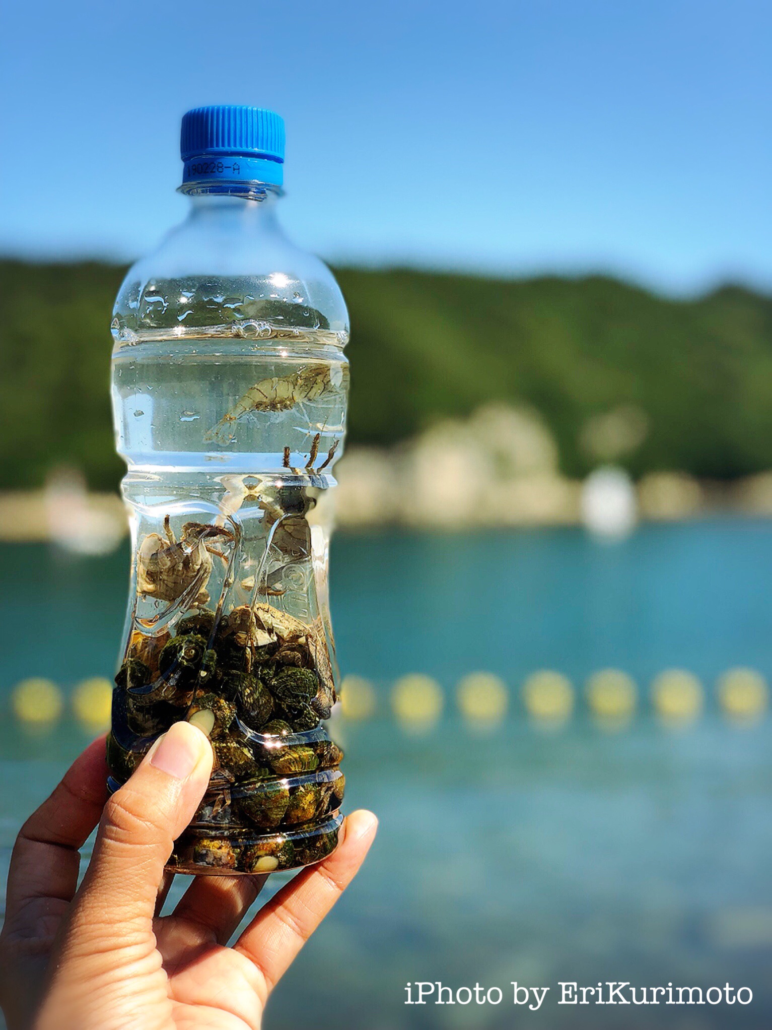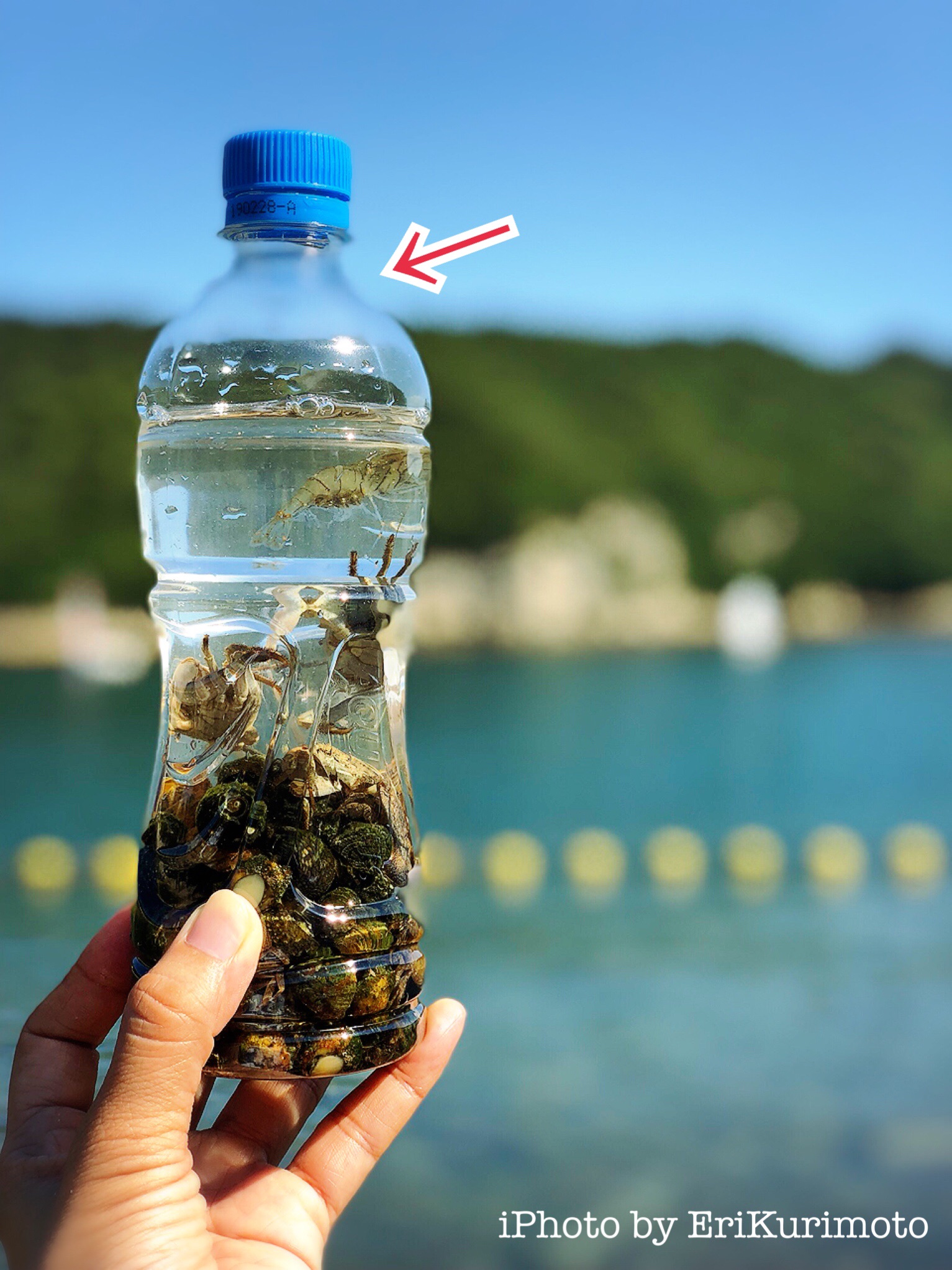 このペットボトルは、夏休み初めに行った無人島旅行での海中探検で見つけたもの!です。