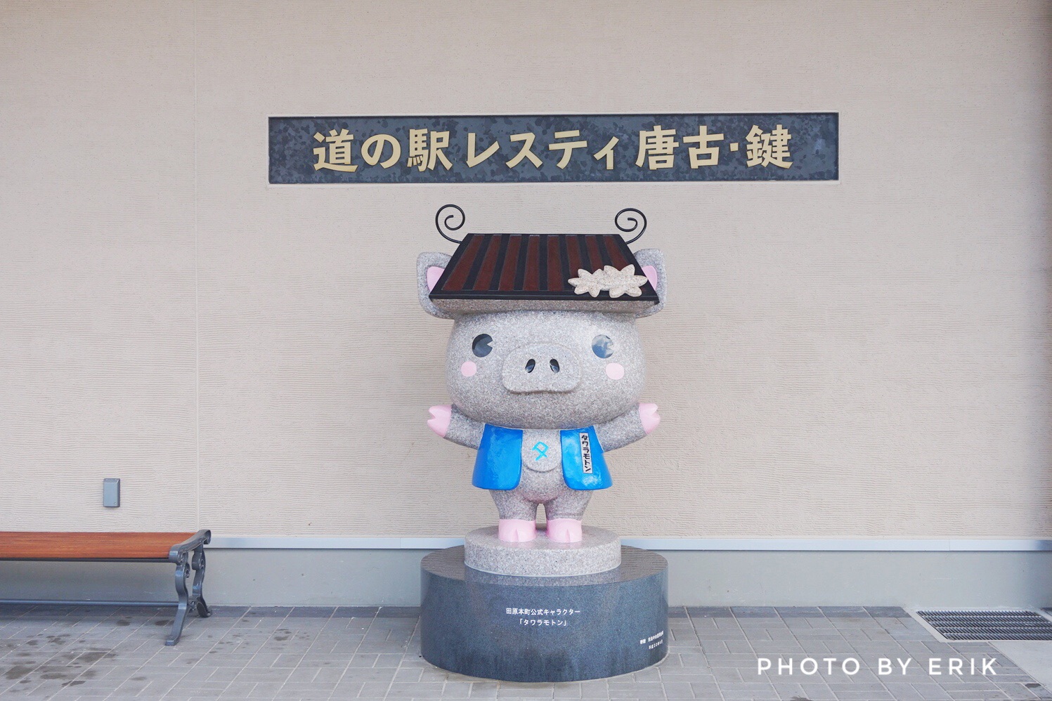 看板の前にはキャラクターの、タワラモトン!