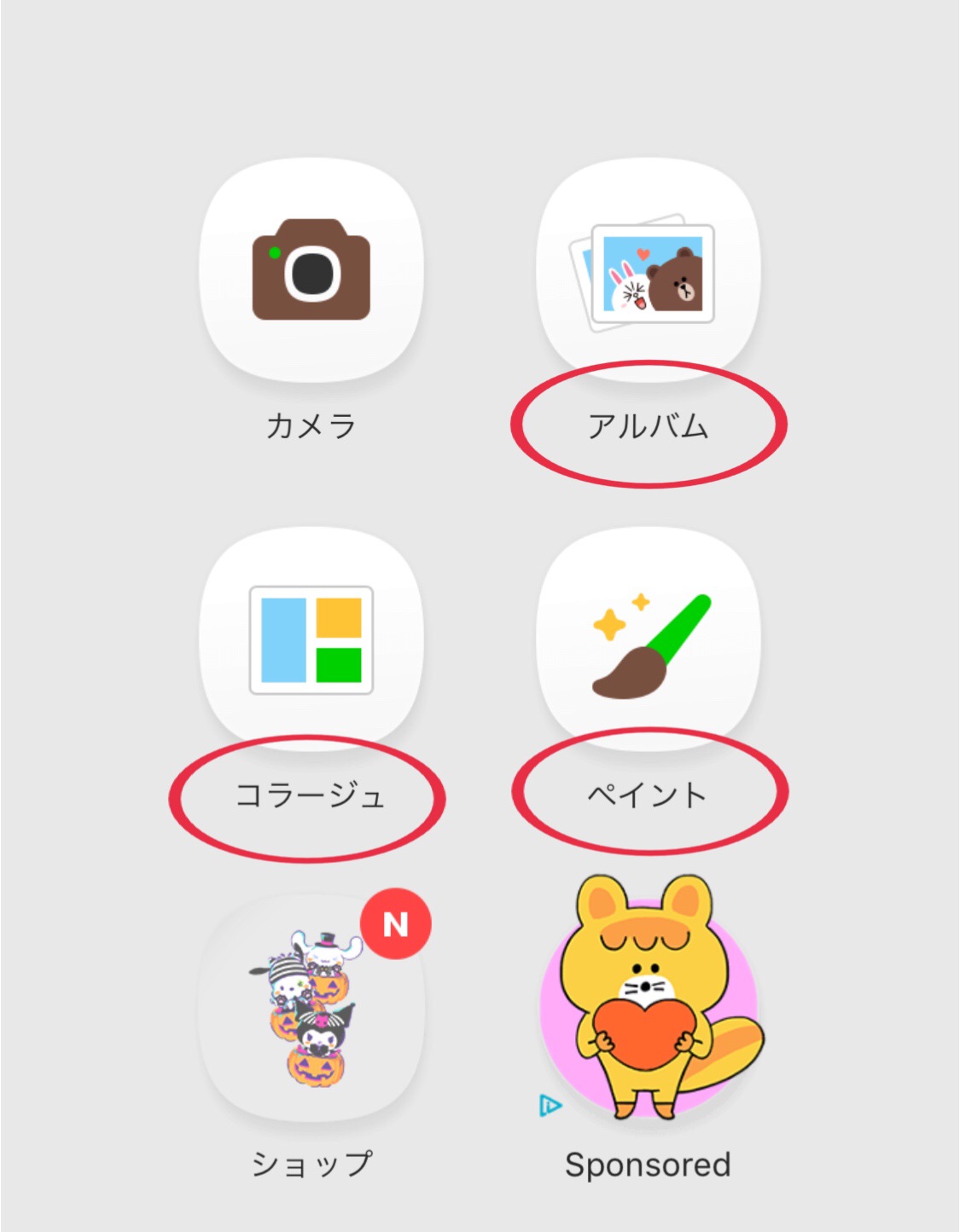 メニュー画面の、アルバム(ギャラリー)、コラージュ、ペイント、どれでもOK。