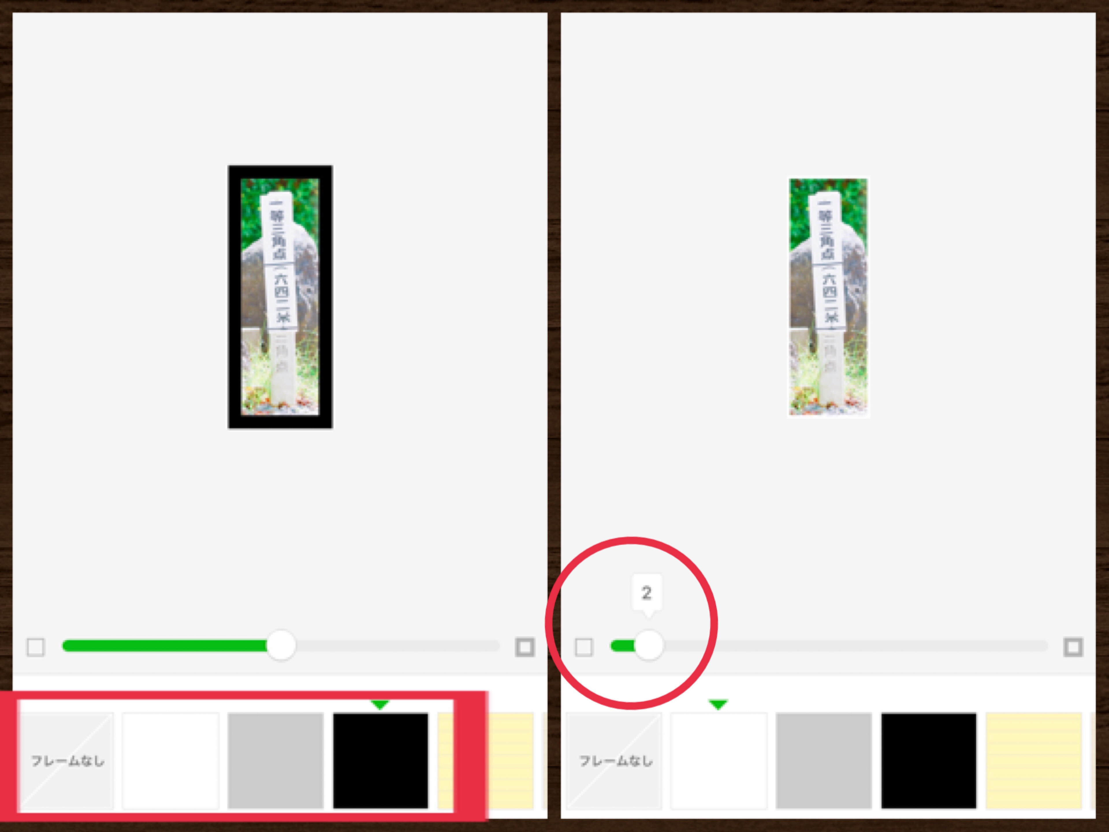 この場合、矢印部分が、写真より大きくカットしちゃってるので、白いフレームだと気付きにくいのでご注意を。