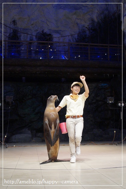 昼間は、イルカが主役で、トレーナーさんたちは、指導員、って感じやったけど。
