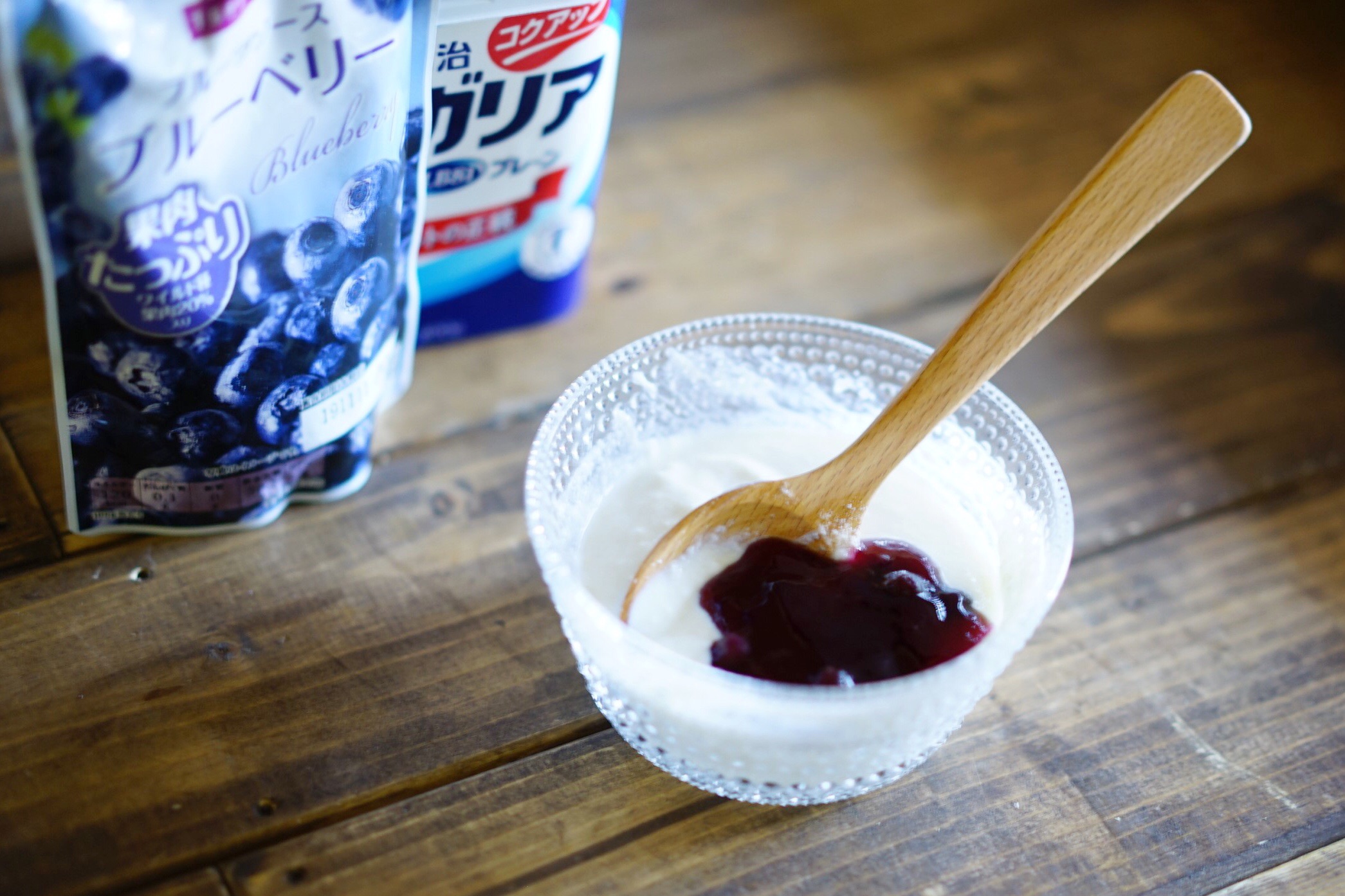 ブルーベリーソースを入れてみたら、味が甘くて美味しくなった分、ザラザラのイヤな感じはさっきほど気にならなくなったカモ。
