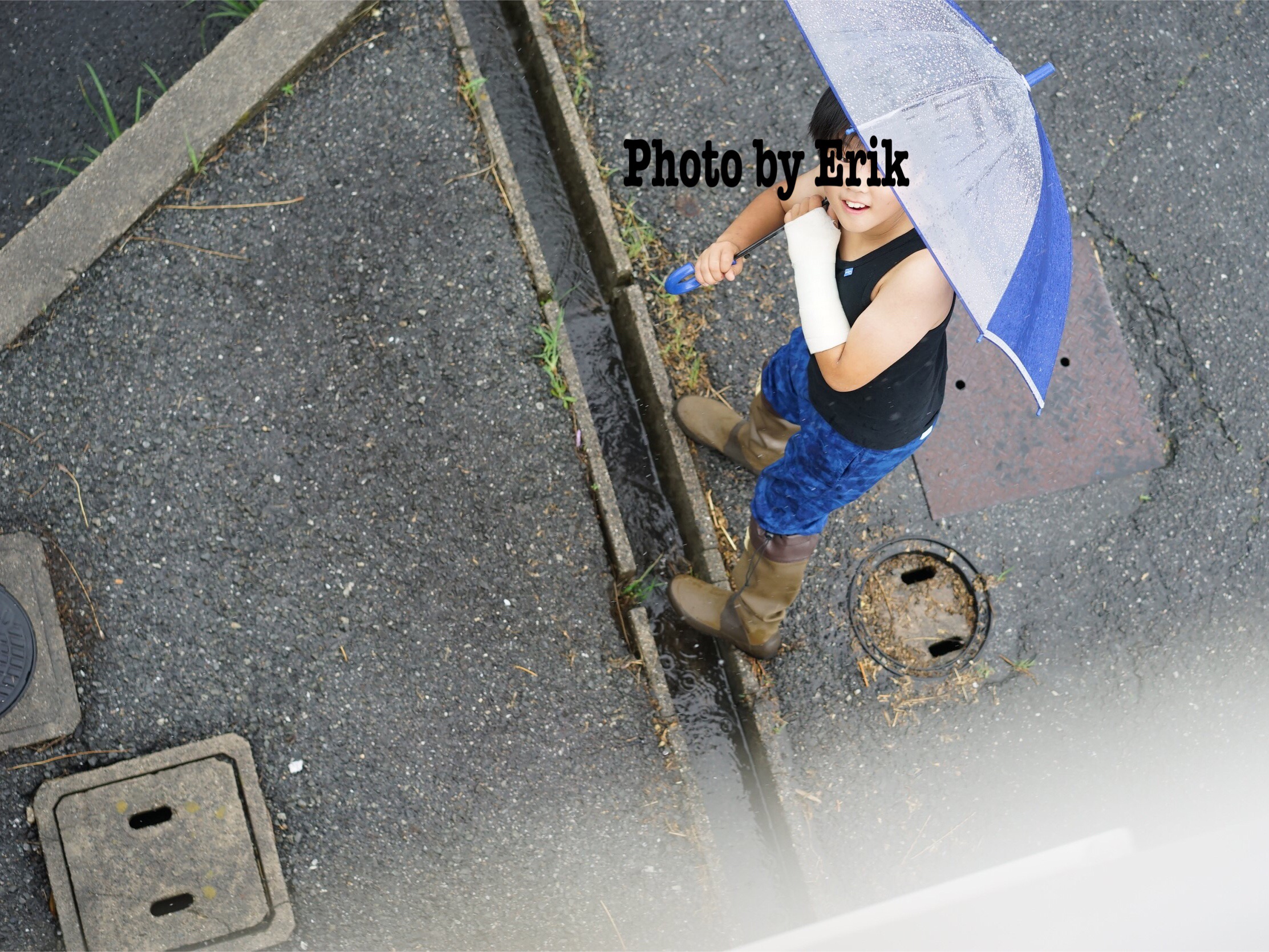 フツー、骨折でギプスしてる時に、雨の中で遊ぶか?