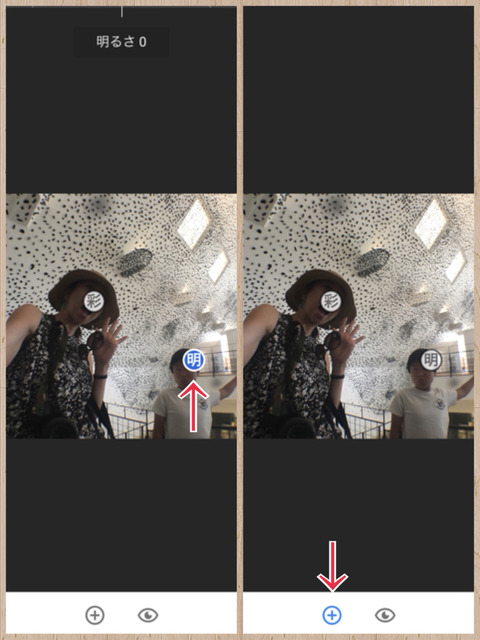 また、他の場所も加工したい時は、画像エリア外などをタップすると、画像内のマークがグレーになり、下部にある「+」が青くなります。