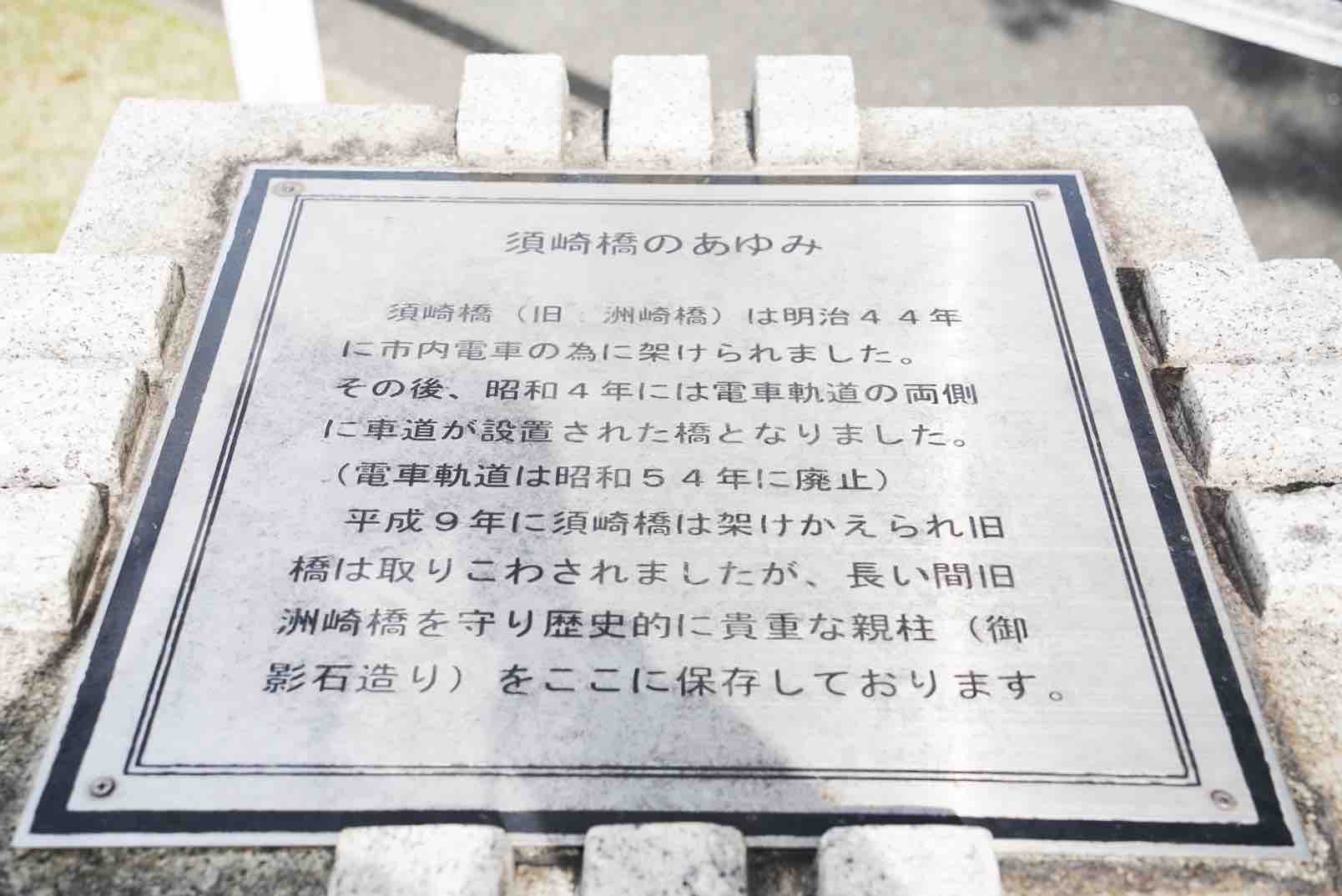 平成9年に須崎橋は架けかえられ旧橋は取りこわされましたが、長い間旧洲崎橋を守り歴史的に貴重な親柱(御影石造り)をここに保存しております。