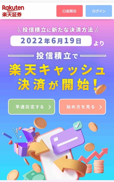 お金持ちは、情報強者で頭が良くて行動が早い(楽天証券・つみたて設定は6/19から楽天キャッシュに!) 2022年06月20日 昨日、2022/06/19から、楽天証券の投資信託のつみたての決済に、楽天キャッシュが使えるようになりました!もう、設定しましたか?7/12までに設定すると、8月の買付分から、楽天キャッシュになり、スタートダッシュキャンペーンに参加できます!▽ エントリーはこちら https ... 続きを読む
