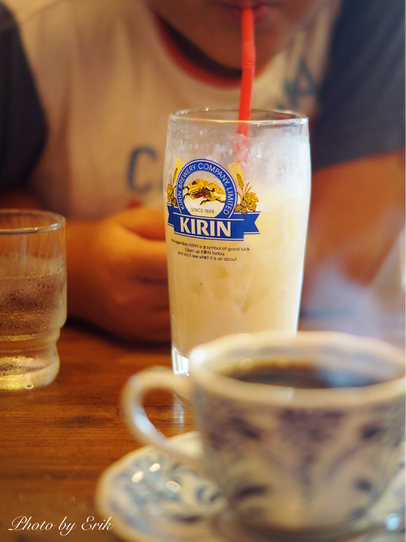 バナナジュース、ビールジョッキで登場です(笑)。