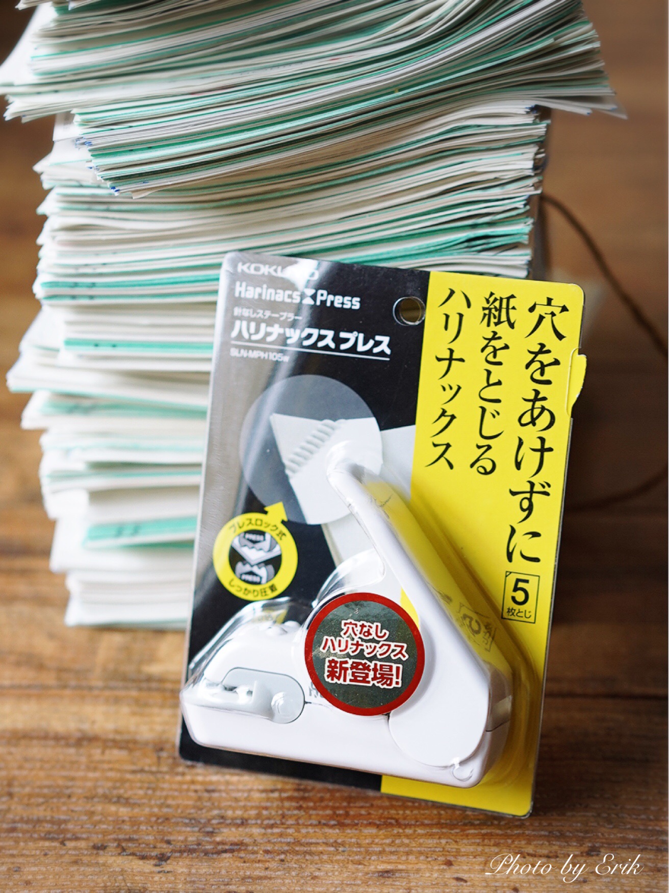 以前、穴を開けて針ナシで綴じれるものを持ってたけど、これは穴が開かないのが嬉しい!