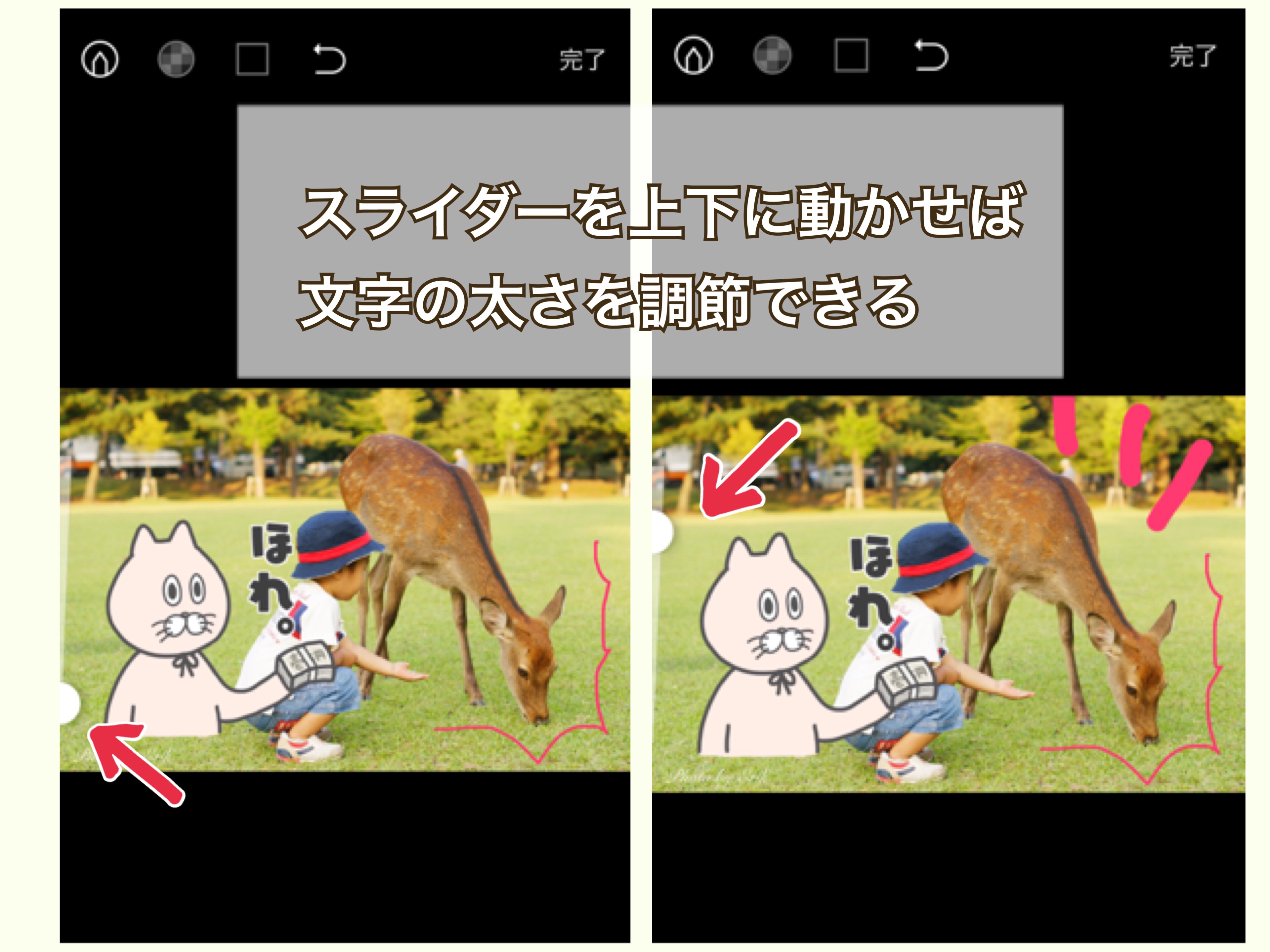 さきほど、スタンプを選んだ時の画面にいろいろ機能が表示されてます。