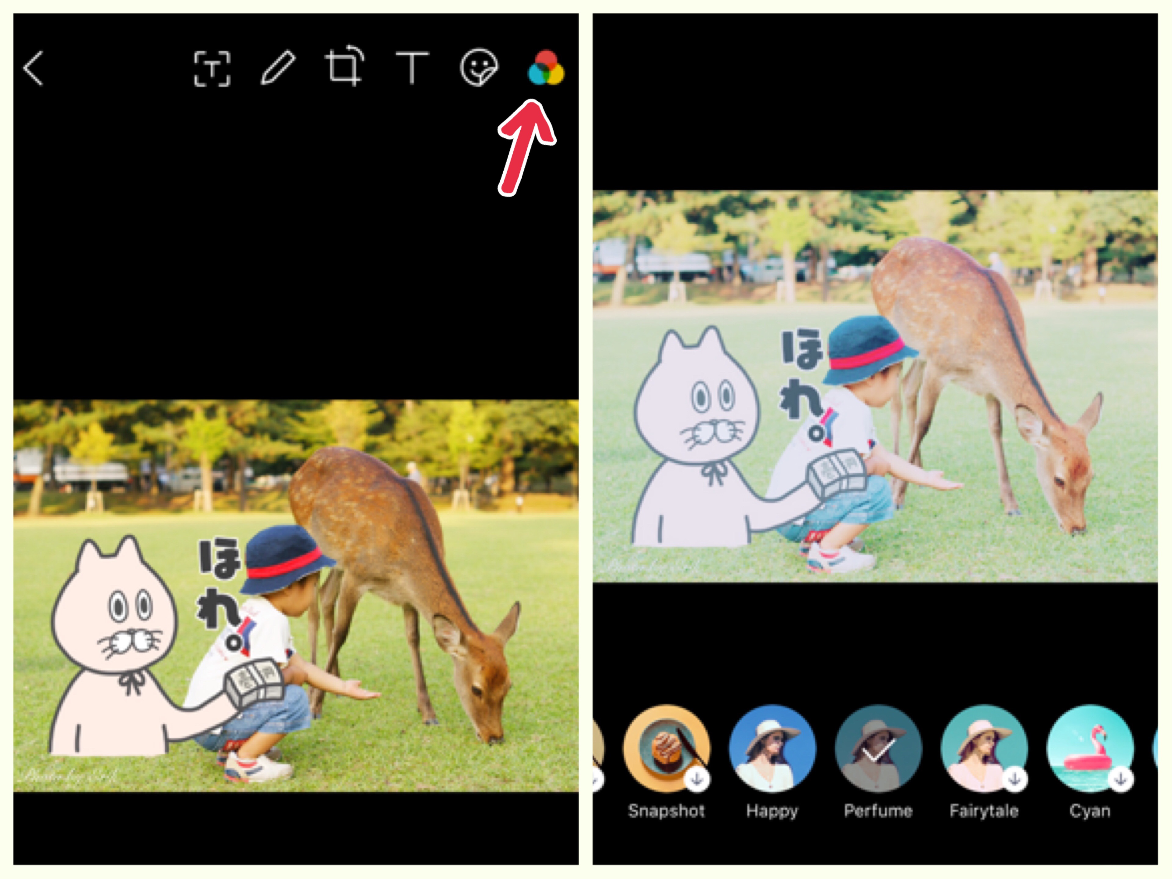 フィルター使っても、編集中に使ったスタンプの色は変わりません。