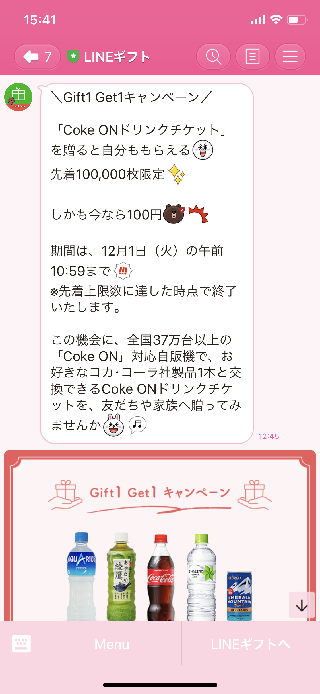 LINEギフトxCokeONドリンクチケット・受け取り方