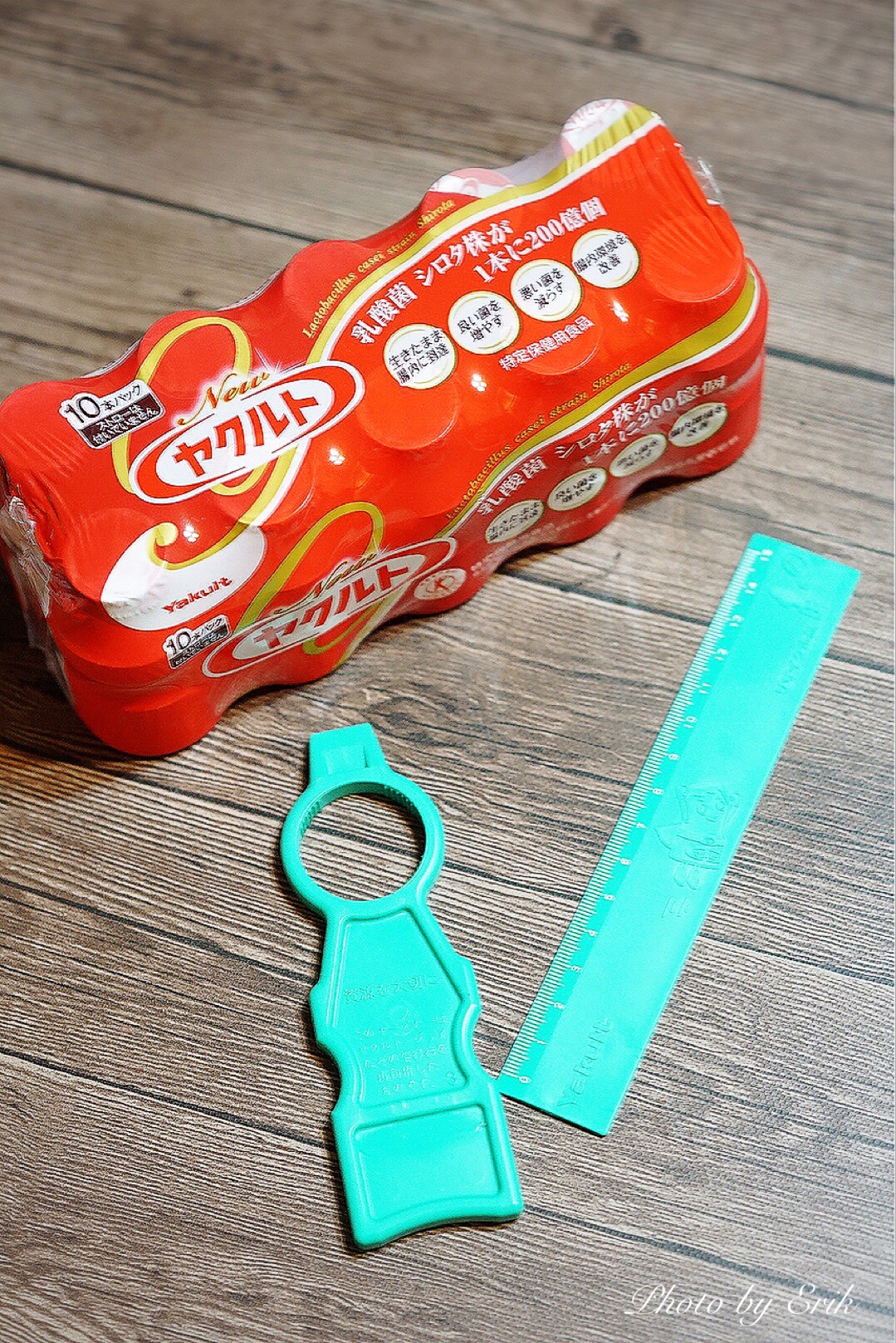 お土産でもらった定規とボトルオープナーは、ヤクルトなどのプラ容器を再利用して作られた非売品のものです。