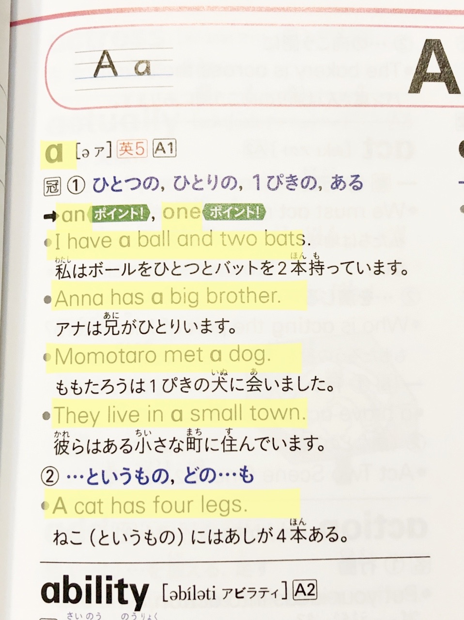 例文も含めて、英語の部分(写真に黄色でマークした部分)は、全て音声で聞くことができるんです。