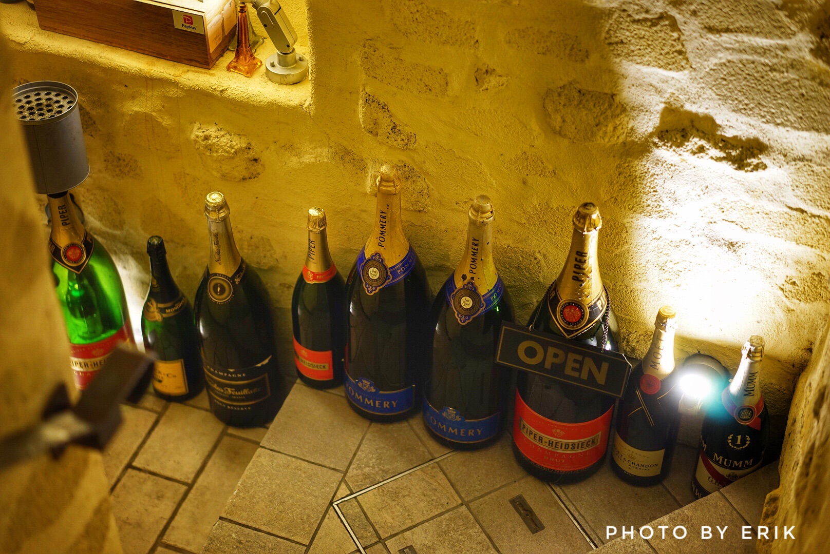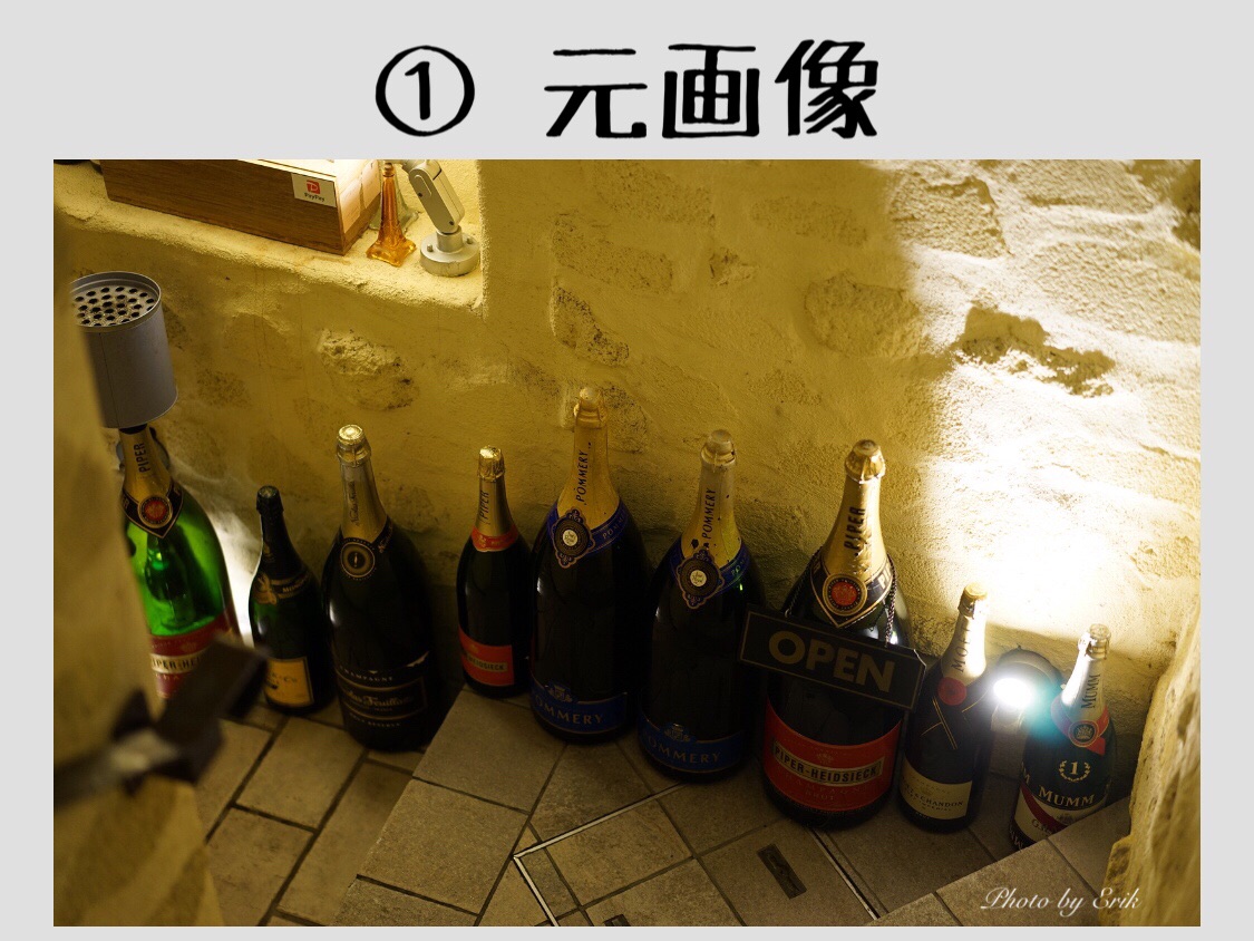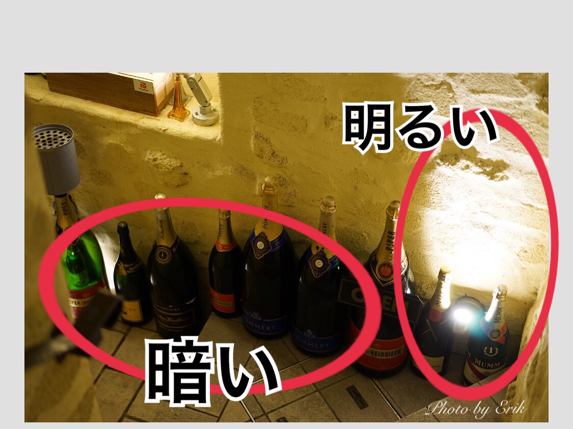 シャンパンのボトルを明るく撮ろうと思うと、右端の電灯がさらに明るいことになってしまいます。